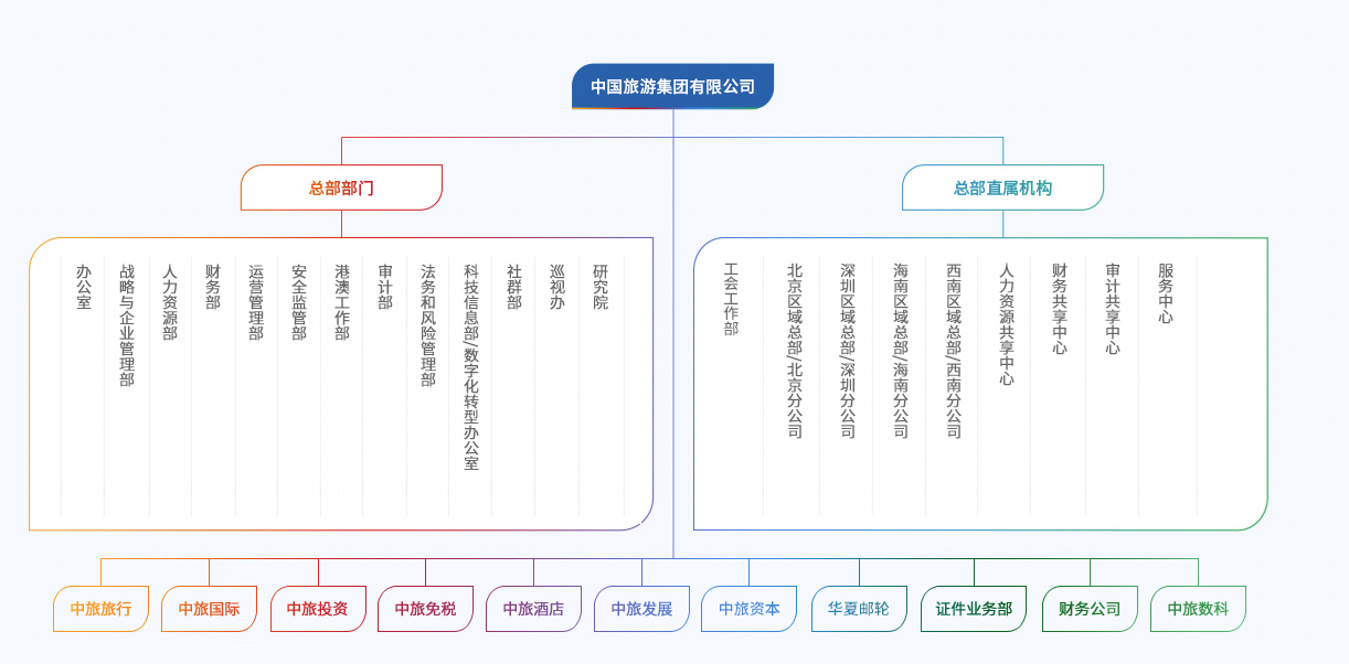 中國旅游集團有限公司暨香港中旅(集團)有限公司是中央直接管理的國有重要骨干企業(yè),也是總部在香港的中央企業(yè)之一。集團歷史可追溯到1923年8月15日上海商業(yè)儲蓄銀行設(shè)立的旅行部。經(jīng)過百余年的發(fā)展,集團形成了由旅行社、景區(qū)、酒店、免稅、旅游交通、證件業(yè)務(wù)、郵輪、地產(chǎn)、文創(chuàng)以及在港綜合業(yè)務(wù)組成的產(chǎn)業(yè)布局,經(jīng)營網(wǎng)絡(luò)遍布內(nèi)地、港澳和海外超過30個國家和地區(qū)。集團旗下匯聚了港中旅、國旅、中旅、中免等眾多知名旅游品牌,是我國唯一一家以旅游為主業(yè)的央企,也是目前我國發(fā)展歷史最長、產(chǎn)業(yè)鏈條較全、經(jīng)營規(guī)模較大、品牌價值較高的旅游龍頭企業(yè)。截至2025年底,集團員工人數(shù)超過4.2萬人,集團總資產(chǎn)超過2000億元,每年接待游客近9千萬人次。目前,集團旅游主業(yè)的基本情況如下: