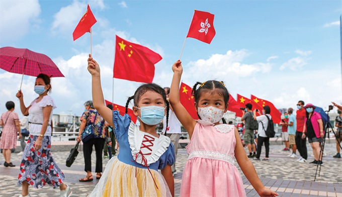 「賀建黨百年,慶香港回歸」。在香港,集團(tuán)制定專門方案,成立專門機(jī)構(gòu),組織開(kāi)展香港政治形勢(shì)課程培訓(xùn)、專項(xiàng)工作大討論和主題黨日活動(dòng), 助力推動(dòng)黨史學(xué)習(xí)教育在香港可見(jiàn)、可感。集團(tuán)組織小區(qū)、員工及香港青少年「尋訪抗戰(zhàn)足跡、聆聽(tīng)歷史故事」,接受愛(ài)國(guó)主義教育。在7月1日舉行的升旗儀式上,護(hù)旗方隊(duì)首次采用中式步操進(jìn)場(chǎng),引人注目。塞拉利昂下紅旗招展,尖沙咀一片紅,吸引許多市民打卡,與國(guó)旗合影。香江岸邊,市民揮舞著五星紅旗或紫荊花區(qū)旗,臉上洋溢著喜悅與自豪。東方之珠以她特有的浪漫方式融入祖國(guó),處處閃耀「中國(guó)紅」。