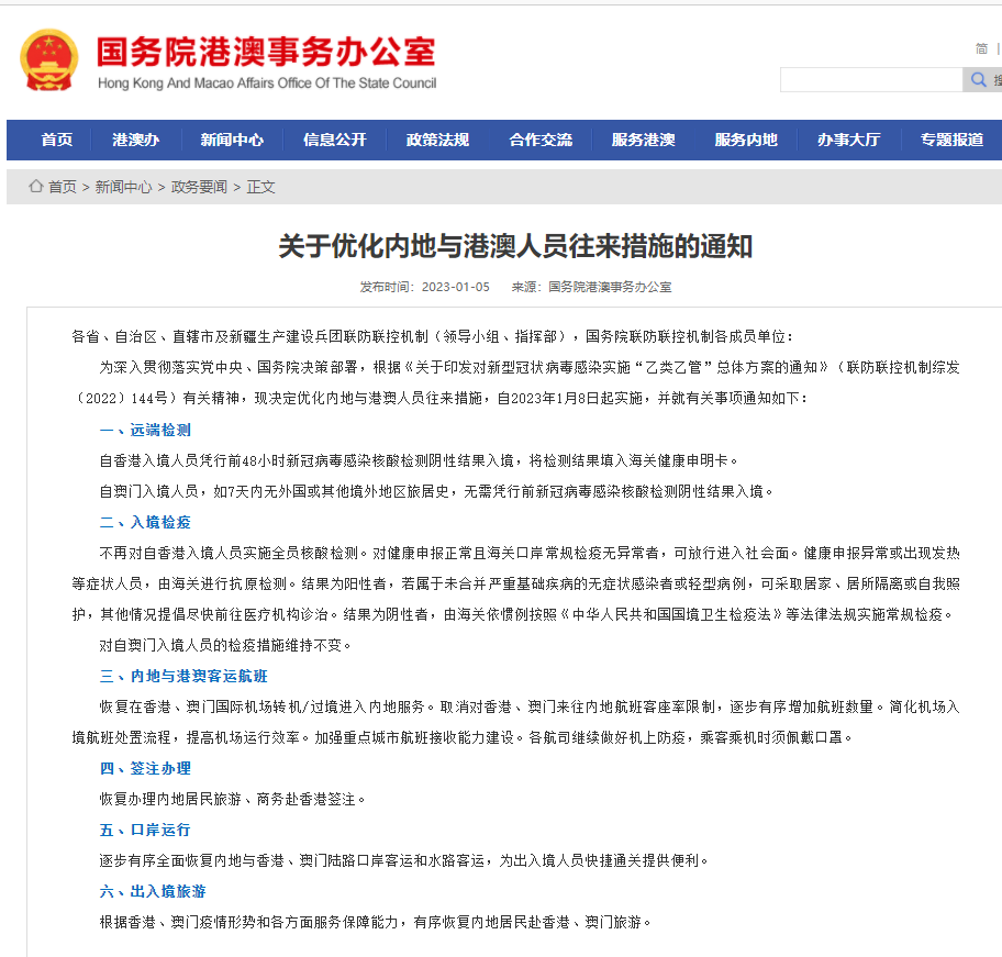 不再對自香港入境人員實(shí)施全員核酸檢測。對健康申報正常且海關(guān)口岸常規(guī)檢疫無異常者,可放行進(jìn)入社會面。健康申報異?;虺霈F(xiàn)發(fā)熱等癥狀人員,由海關(guān)進(jìn)行抗原檢測。