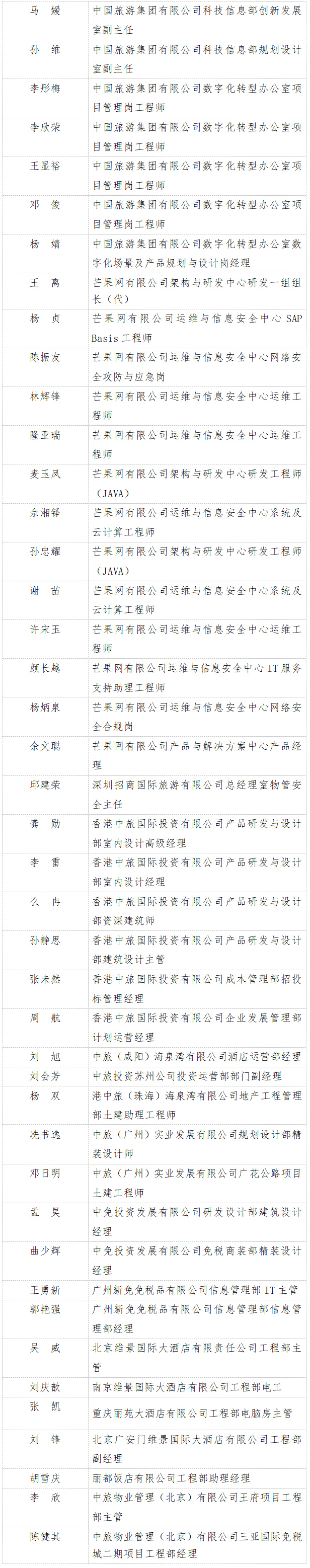 根據(jù)《中國(guó)旅游集團(tuán)有限公司會(huì)計(jì)、工程系列高級(jí)職稱評(píng)審暫行辦法》《中國(guó)旅游集團(tuán)有限公司工程系列初、中級(jí)職稱評(píng)審暫行辦法》規(guī)定,按照《關(guān)于開展2022年度中國(guó)旅游集團(tuán)工程系列職稱評(píng)審工作的通知》(中國(guó)旅游集團(tuán)人通〔2022〕151號(hào))工作安排,現(xiàn)將2022年度集團(tuán)工程系列職稱評(píng)審結(jié)果予以公示。
