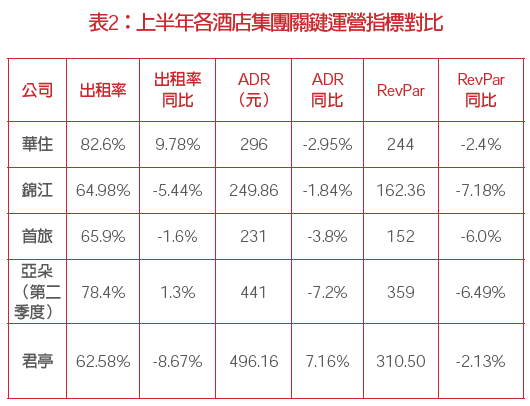 受上半年宏觀消費(fèi)以及去年高基數(shù)影響,上半年各大酒店集團(tuán)出租率表現(xiàn)分化,RevPAR、ADR則普遍出現(xiàn)下滑。上半年,受宏觀經(jīng)濟(jì)不確定以及消費(fèi)者信心不足等因素影響,商旅需求方面,差旅預(yù)算收緊,商務(wù)差旅活動(dòng)更多集中在中心城市。旅游需求方面,消費(fèi)信心下滑,酒店行業(yè)面臨消費(fèi)分級(jí)的壓力,此外,二季度開始極端天氣明顯,出行減少。從出租率來看,華住和亞朵酒店保持了正增長,分別同比增長9.78個(gè)百分點(diǎn)和1.3個(gè)百分點(diǎn);錦江同比下降5.44個(gè)百分點(diǎn),首旅則微降1.6個(gè)百分點(diǎn),君亭酒店下降8.67個(gè)百分點(diǎn)。從平均房價(jià)和間房收益來看,亞朵和君亭酒店作為中高端酒店的代表,其平均房價(jià)和間房收益明顯高于華住、錦江和首旅酒店,但從同比來看,受整體宏觀環(huán)境及惡劣天氣影響,亞朵和君亭酒店的同比降幅也較大,其中君亭酒店旗下新安江景瀾酒店遭受的持續(xù)大雨和洪澇災(zāi)害致使酒店停業(yè)抗災(zāi)長達(dá)半月之久。華住集團(tuán)預(yù)計(jì)今年7、8兩月暑期數(shù)據(jù)將同比下降10%左右。