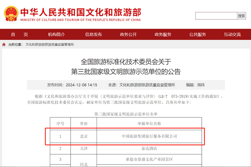 12月6日,全國旅游標(biāo)準(zhǔn)化技術(shù)委員會發(fā)布“關(guān)于第三批國家級文明旅游示范單位評定結(jié)果的公告”,中旅旅行榮獲“國家級文明旅游示范單位”稱號,是此次北京市唯一獲此殊榮的單位。