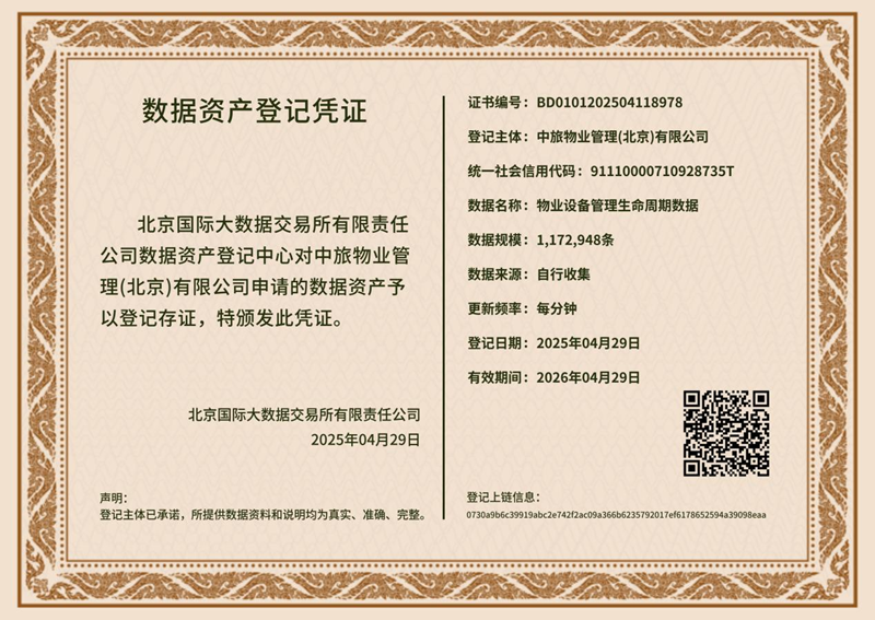 5月9日,經北京國際大數據交易所(北數所)合規(guī)審核,中旅資產成功獲得“物業(yè)設備全生命周期”數據資產登記憑證。本次獲得登記憑證的“物業(yè)設備全生命周期”數據集,涵蓋設備采購、運行監(jiān)測、維護保養(yǎng)、報廢處置等全流程數據,形成設備狀態(tài)、能耗分析、故障預警等維度,為物業(yè)行業(yè)數據要素市場化提供了可復制的實踐方案。這是中旅資產落實國家數據要素市場化配置改革、響應國資委數字化轉型戰(zhàn)略的重要突破,標志著其數據資源正式轉化為數據資產,在合規(guī)管理與價值釋放方面取得實質性進展。