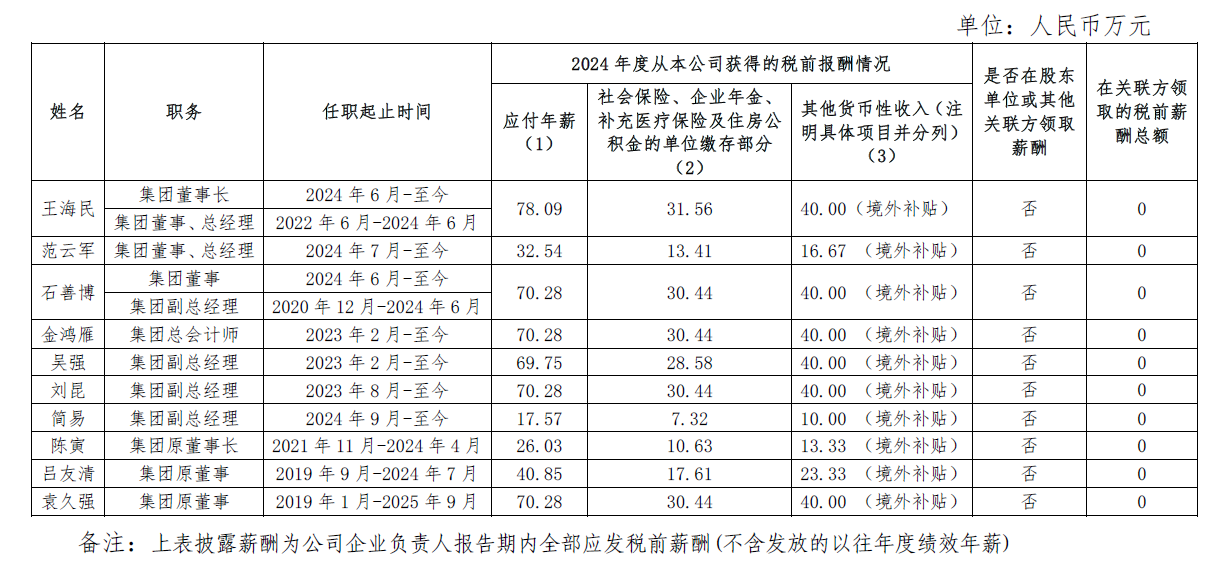 中國旅游集團(tuán)有限公司企業(yè)負(fù)責(zé)人2024年度薪酬情況