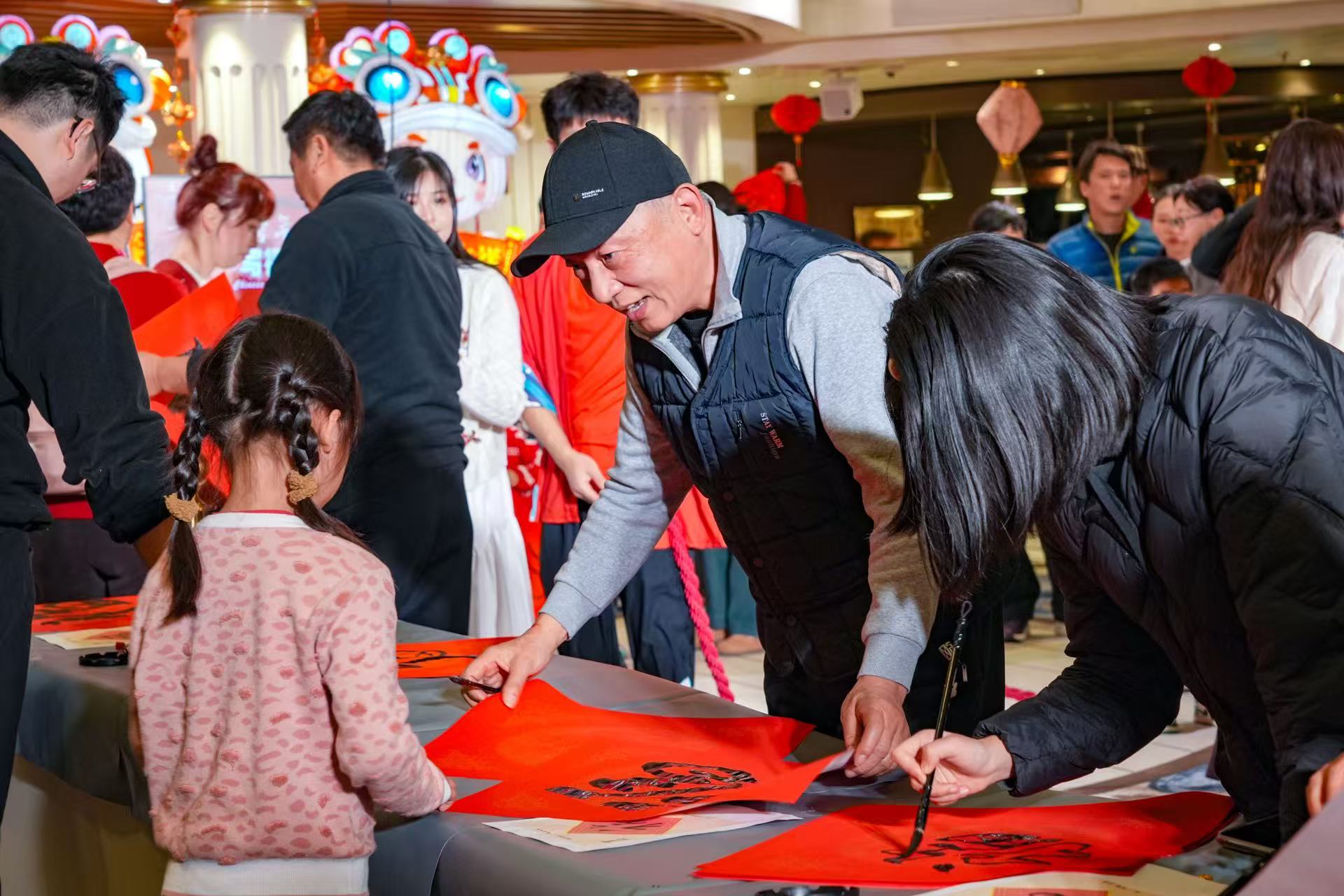 “愛達(dá)?魔都”號(hào)除了舉辦寫春聯(lián)、剪紙等傳統(tǒng)手工藝活動(dòng)外,還帶來舞獅講堂等互動(dòng)環(huán)節(jié),讓中外旅客近距離感受中華傳統(tǒng)文化的魅力?!皭圻_(dá)?地中海”號(hào)特邀國(guó)家級(jí)非遺項(xiàng)目佛山彩燈代表性傳承人黃敏言與國(guó)家級(jí)非遺項(xiàng)目佛山木版年畫代表性傳承人劉鐘萍登船,指導(dǎo)旅客制作寓意 "魚躍福來" 的迷你彩燈,刷印吉祥年畫,感受具有嶺南韻味的非遺文化?!肮睦藥Z”號(hào)上的旅客們踴躍參與書法賜福、燈籠制作等特色互動(dòng),共同度過充滿文化氛圍的“海上中國(guó)年”。