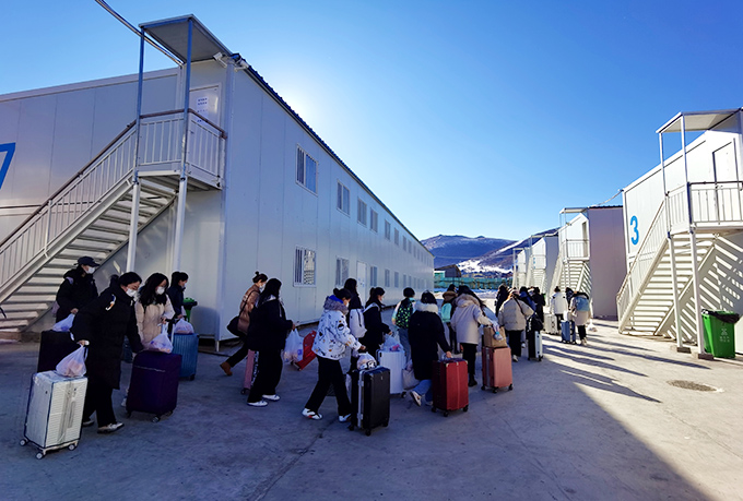 從首都北京到冰雪小鎮(zhèn)。由冬奧會項目前方副總指揮王大勇帶隊,車隊伴著朝陽一路向北。在冬奧項目組工作人員和學校老師的陪伴下,同學們品嘗著由北京麗都維景酒店提供的早餐食品,欣賞著清晨北京城區(qū)的都市天際,遠眺著京禮高速公路沿線的風景,一路感受著冬奧氛圍的漸行漸近。12月1日中午11時許,藍天下北京向北200公里以外的冰雪魅力小鎮(zhèn)崇禮忙碌如常,有序完成核酸檢測后,同學們乘坐的大巴車順利抵達集團冬奧服務團隊駐地。