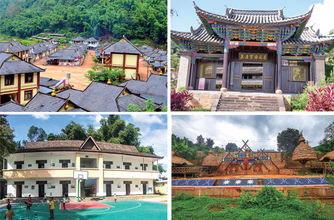 圖1-4:娜允鎮(zhèn)賀雅小組民族特色村寨照片;孟連宣扶司署;富巖鎮(zhèn)大曼糯小學(xué)新建宿舍樓;孟連芒信鎮(zhèn)拉嘎村永前老寨鄉(xiāng)村旅游建設(shè)項(xiàng)目