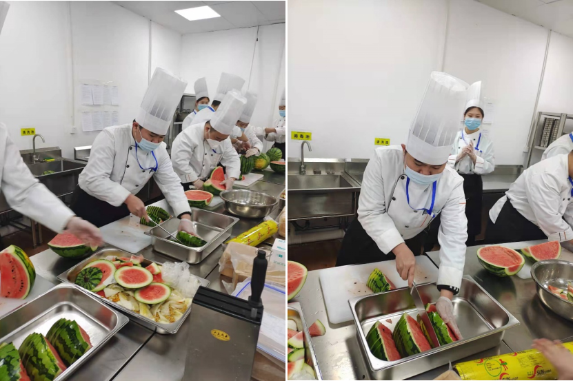 隨著冬奧會的臨近,人員也陸續(xù)到崗,除了李進(jìn)曉和另一位骨干是熟手外,其余的2名基層員工、16名實習(xí)生都是沒什么經(jīng)驗的,這時候前期寫的菜單說明就派上了用場。為了讓大家盡快熟悉菜品的制作,培訓(xùn)成了每天的常態(tài)工作。李師傅又開始對員工進(jìn)行一次次的培訓(xùn)。從食材的選擇到調(diào)料的配比,從加工制作的方法到最終出品的要求,每個環(huán)節(jié)、每個要點(diǎn)都耐心講解,遇到培訓(xùn)學(xué)員不甚明白的也是不厭其煩的解釋。為了檢驗學(xué)員的成果,李進(jìn)曉會隨時“考試”,拿起一個器皿就問“這是干什么用的?”又或者提一個汁醬名就問“需要什么材料?”“什么配比?”再或者說一個水果就問“上原果還是要切配?”“怎么清洗?”“消毒水是什么配比?”“怎么切?”如此反復(fù),學(xué)員就會繃緊弦,認(rèn)真的記,反復(fù)的操練,直到達(dá)到要求為止。他的理念是:做菜馬虎不得,為冬奧做菜更是玩不得半點(diǎn)虛的,一定要付出最大的責(zé)任心,飽含熱愛,才能讓客人在品嘗美味同時,感受被重視的幸福感,這樣做出來的菜品才是成功的。