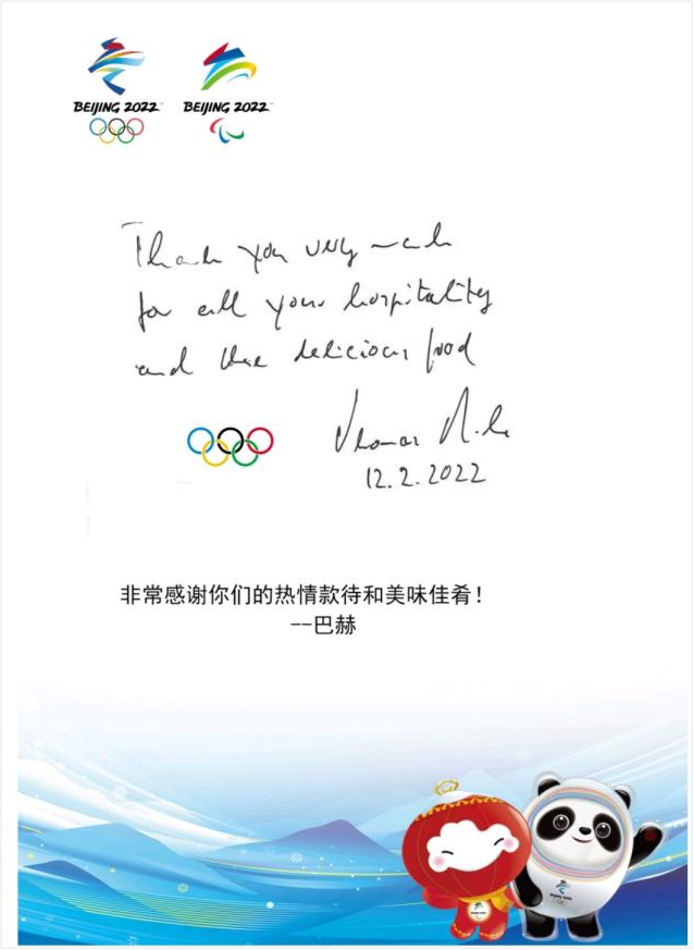 集團(tuán)中旅酒店高質(zhì)量高標(biāo)準(zhǔn)提供住宿餐飲服務(wù)、接待服務(wù),全力以赴做好各項(xiàng)服務(wù)保障工作,受到國際奧委會(huì)多次贊揚(yáng)。國際奧委會(huì)主席巴赫在張家口冬奧村運(yùn)動(dòng)員餐廳就餐后,特別留言點(diǎn)贊張家口冬奧村的餐飲服務(wù),寫道:“非常感謝你們的熱情服務(wù)和美味佳肴”。國際奧委會(huì)北京冬奧會(huì)協(xié)調(diào)委員會(huì)主席胡安·安東尼奧·薩馬蘭奇“微服私訪”張家口冬奧村運(yùn)動(dòng)員餐廳,經(jīng)過手消、選餐、取餐、用餐等一系列流程的親身體驗(yàn),他對張家口冬奧村的餐飲服務(wù)贊不絕口,并專門手寫感謝留言。