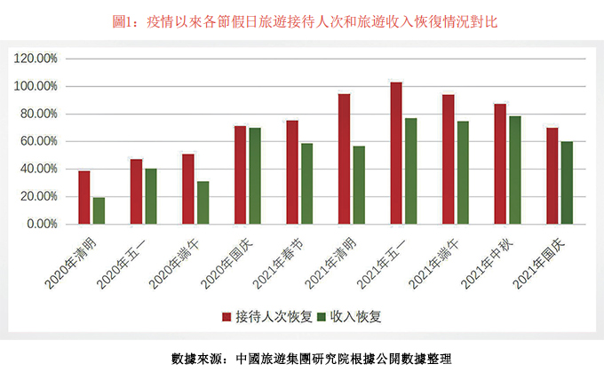 國內(nèi)旅游呈現(xiàn)先高后低、跌宕起伏的復(fù)蘇特征。受益于疫情的有效控制,國內(nèi)旅游在全球率先復(fù)蘇,但2021年下半年以來,受疫情多點散發(fā)、跨省游熔斷「常態(tài)化」等影響,復(fù)蘇速度有所減慢。根據(jù)中國旅游研究院最新預(yù)測數(shù)據(jù),2021年國內(nèi)旅游接待人數(shù)恢復(fù)到2019 年的57%,國內(nèi)旅游收入恢復(fù)到2019年的53%,顯著低于其對2021年上半年的預(yù)測數(shù)據(jù)。中國旅游研究院此前預(yù)測數(shù)據(jù)顯示,2021上半年國內(nèi)旅游接待人次恢復(fù)到疫情前的7成左右。節(jié)假日出行市場先行復(fù)蘇。2021年春節(jié)、清明、五一、十一等節(jié)假日國內(nèi)旅游人數(shù)分別恢復(fù)到疫情前同期的75.3%、94.5%、103.2%和70.1%,國內(nèi)旅游收入恢復(fù)到疫情前同期的58.6%、56.7%、77.0%和59.9%,好于年度恢復(fù)情況。主要客源地恢復(fù)優(yōu)于主要目的地??拷饕驮词袌龅穆糜尉皡^(qū)客流增長趨勢明顯,而面向中遠(yuǎn)程旅游市場的自然資源和歷史文化資源型旅游景區(qū)接待人次和綜合旅游收入下降明顯。中國旅游研究院專項調(diào)查數(shù)據(jù)顯示,游客目的地平均游憩半徑從2020年的14.2公里收縮到2021年的13.1公里。