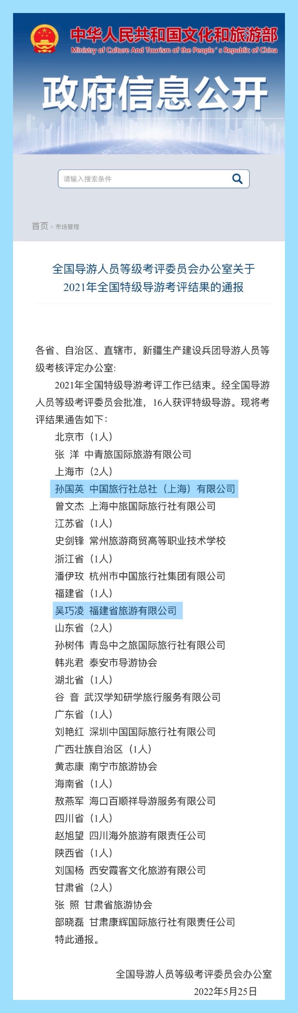 5月25日,文化和旅游部發(fā)布《全國導游人員等級考評委員會辦公室關于2021年全國特級導游考評結果的通報》。作為時隔24年后重啟的中國導游界至高榮譽,全國特級導游考評自去年10月啟動,歷經七個月嚴格的初審和終審考核,最終確定集團旅行業(yè)務所屬福建省旅吳巧凌和中旅上海公司孫國英等在內的16名人員獲評此稱號。