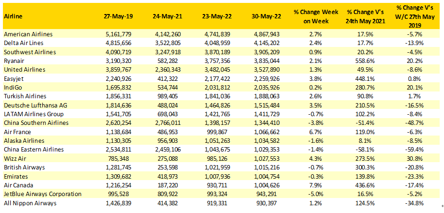 航司運(yùn)力Top 10名單本周沒有變化,而第11-20位的排名則有所變化。Wizz航空從第18名上升到了第15名,對比2019年同期增加了近三分之一的運(yùn)力。