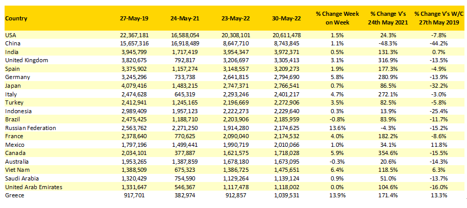 正如OAG上周提到的,全日空本周運(yùn)力重歸Top 20航司榜單,這也受到日本6月10日加速開放旅游的利好消息的影響。本周全日空運(yùn)力增長1.2%,將美國精神航空擠到第21位。中國國航本周仍在Top 20榜單之外,盡管其運(yùn)力也有略微的環(huán)比增長,比其他中國航司略好。