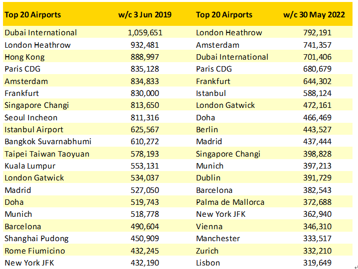 隨著西歐市場繼續(xù)強(qiáng)勢復(fù)蘇,國際機(jī)場的排行榜也變得頗具看點(diǎn)。目前全球Top 20的國際機(jī)場排行榜仍然由歐洲樞紐機(jī)場壟斷,西歐機(jī)場占據(jù)了16個(gè)席位。而值得關(guān)注的榜單缺席者包括有中國香港及臺北、韓國仁川、泰國曼谷、馬來西亞吉隆坡等機(jī)場,而新加坡機(jī)場已經(jīng)回歸Top 20之列,排在第11名,不過新加坡機(jī)場也只是恢復(fù)了2019年同期一半的運(yùn)力。倫敦希思羅機(jī)場本周拔得頭籌,阿姆斯特丹緊隨其后。