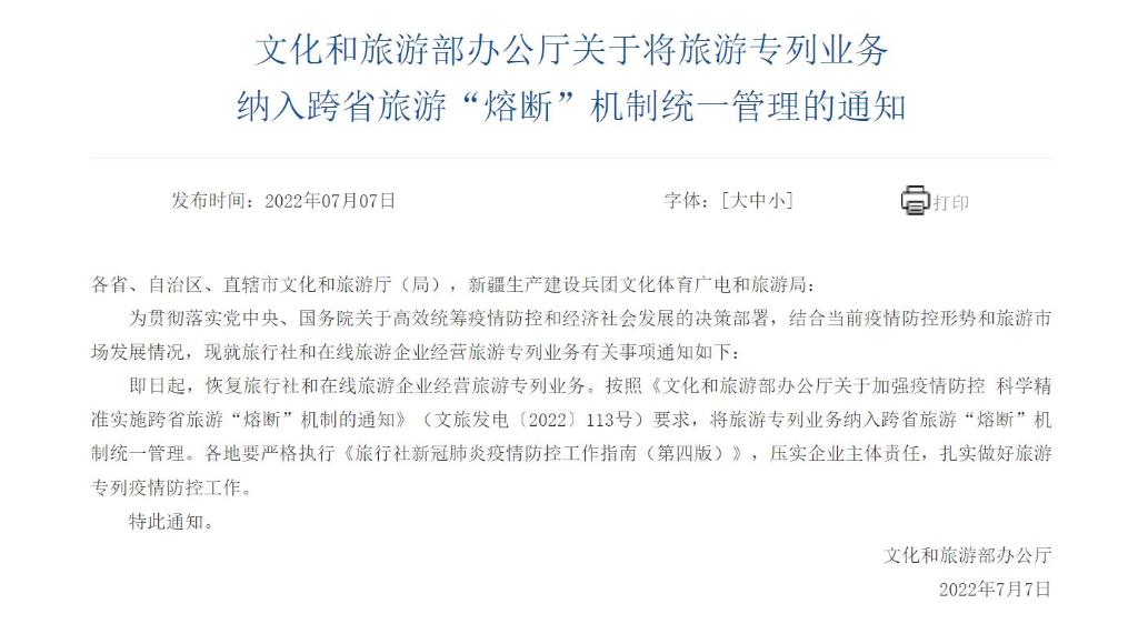 文化和旅游部辦公廳7月7日發(fā)布通知要求,即日起,恢復(fù)旅行社和在線旅游企業(yè)經(jīng)營旅游專列業(yè)務(wù);按照相關(guān)規(guī)定,將旅游專列業(yè)務(wù)納入跨省旅游“熔斷”機制統(tǒng)一管理。