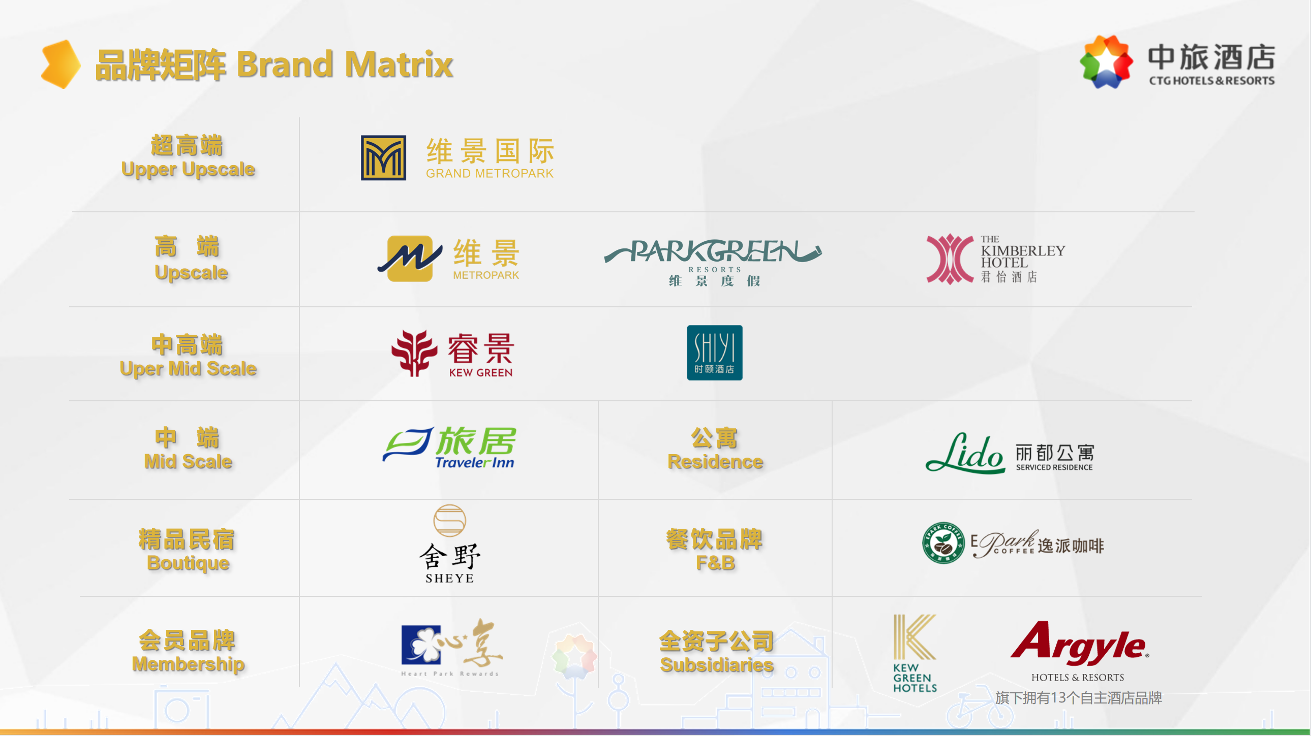 中旅酒店旗下擁有“維景國際”“維景”“睿景”“旅居”“麗都公寓”“雅閣”“澳斯特”等二十余個品牌,覆蓋超高端、高端、中高端、中端、公寓、民宿等各類產品線,全資控股英國KG酒店集團,戰(zhàn)略投資雅閣酒店集團。