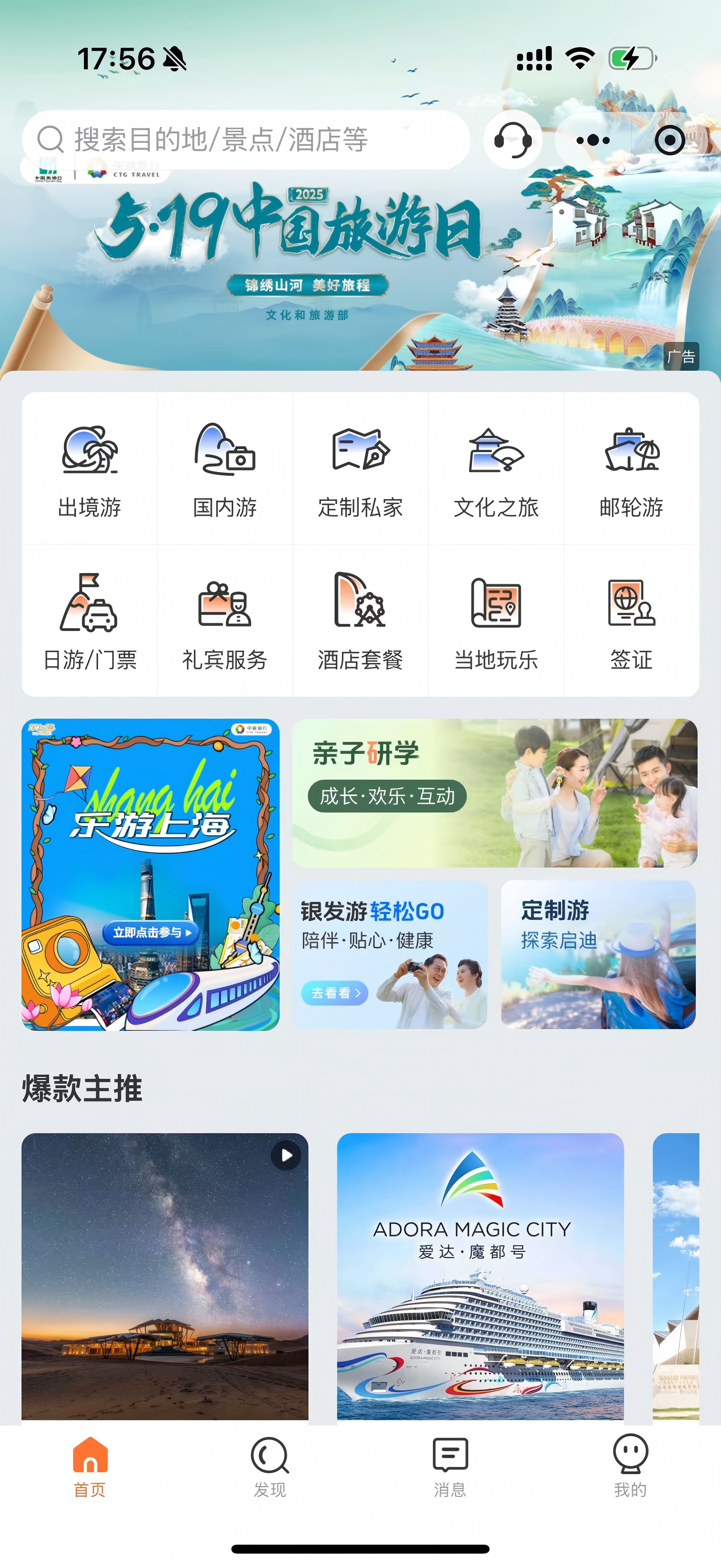 “中旅旅行”線上銷售平臺包括PC網(www.ourtour.com)、App和小程序,提供國內及出境跟團游、自由行、定制游、郵輪、機票、酒店、簽證等旅游產品一站式服務?!爸新寐眯小睂⒅新?、國旅、港中旅三大品牌的優(yōu)質旅游資源進行整合,進行統(tǒng)一的展現(xiàn)和銷售;整合集團內維景酒店、星旅郵輪、景區(qū)、旅游金融等優(yōu)質資源,升級具有核心競爭力的自有產品體系,滿足消費者的美好出行需求。